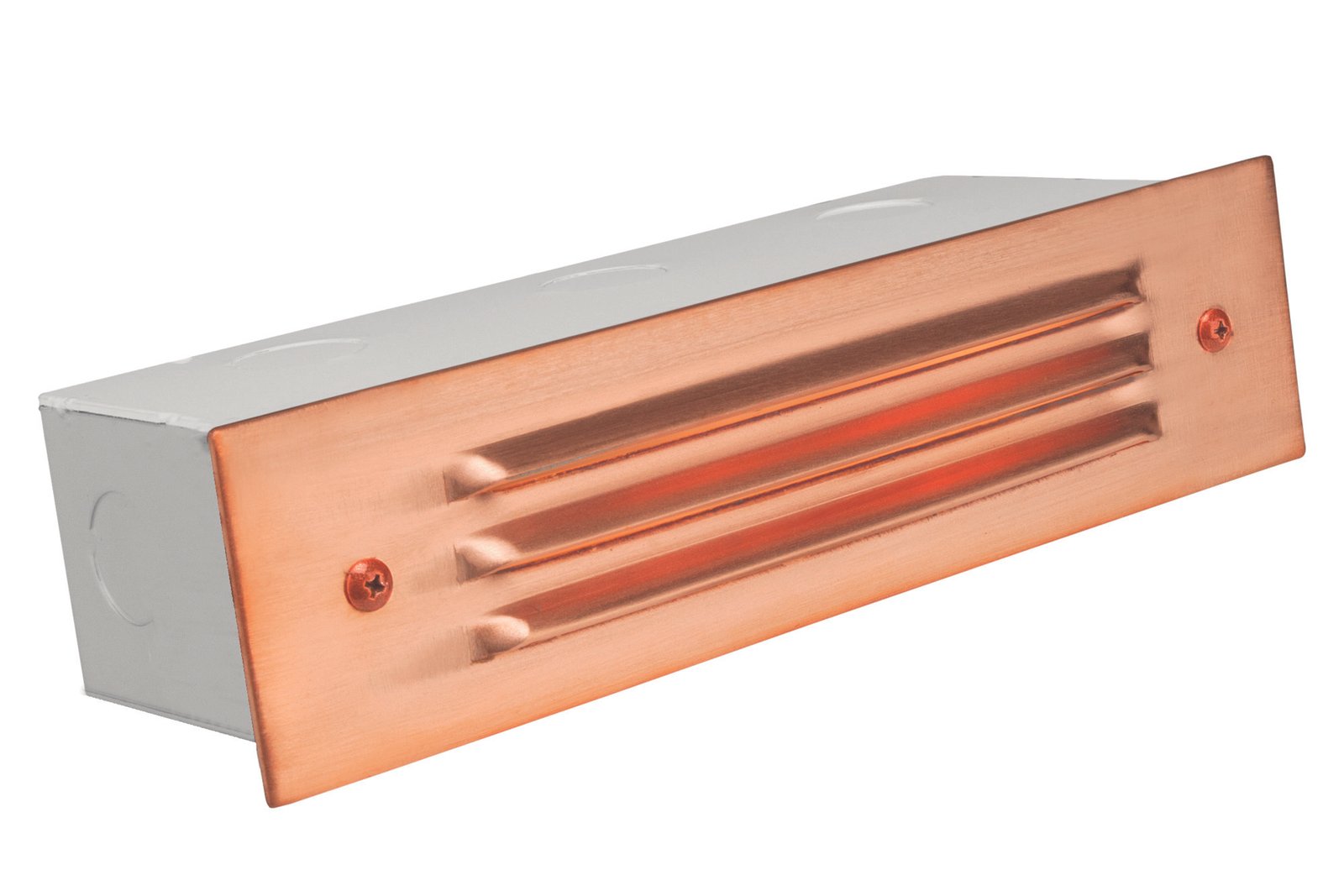 Stamped copper 3-louver Brick Light, with a self-levelling heavy duty steel mount box, in a Raw Copper finish.