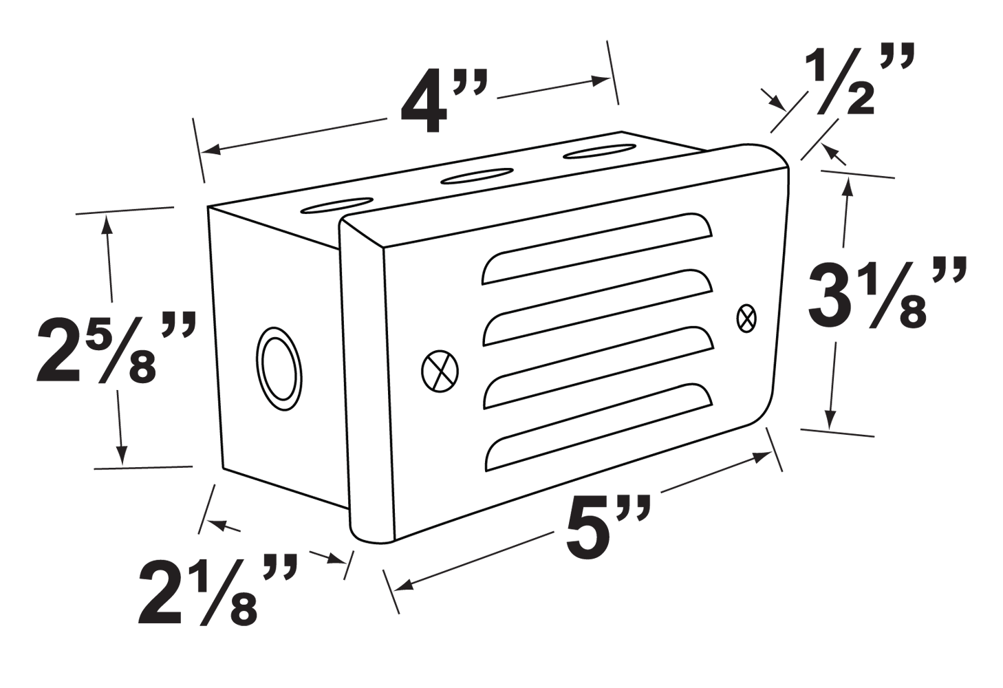 Stamped brass 4-louver Step Light, with a frosted lens, and a white powder coated self-levelling heavy duty steel mount box, faceplate is finished in Antique Bronze.